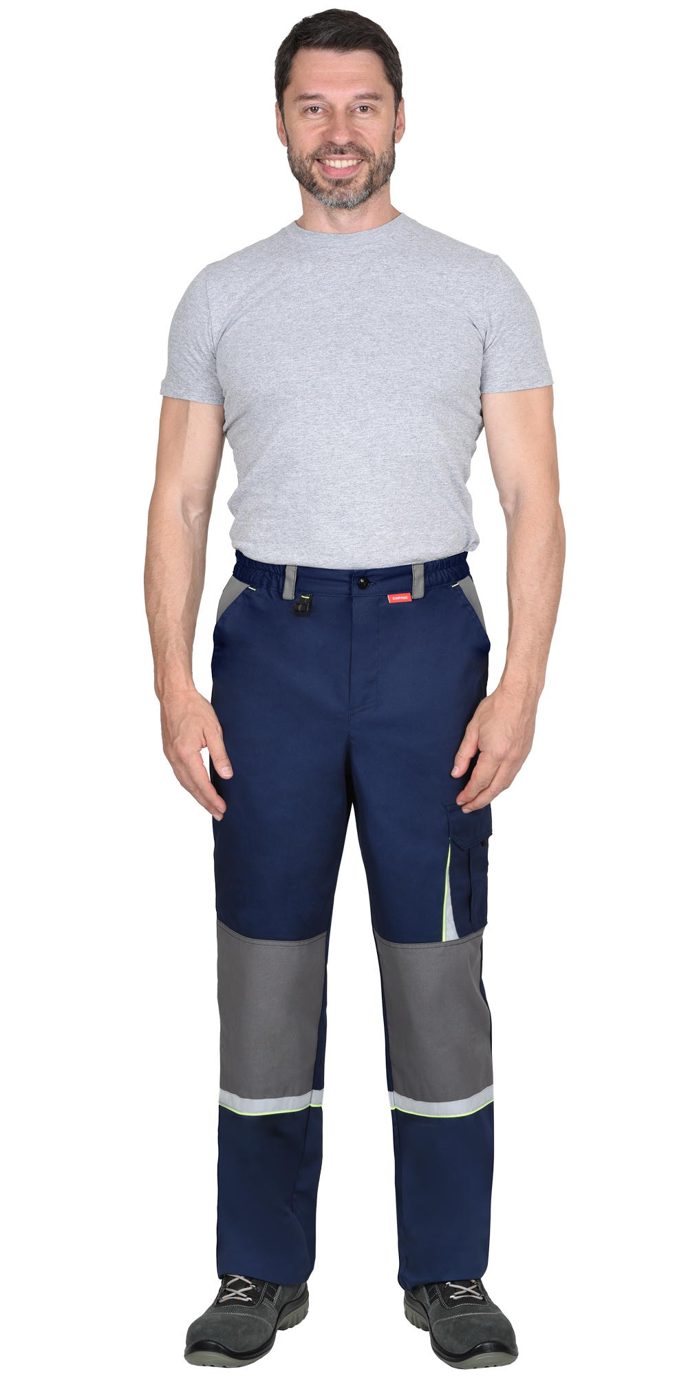 Брюки прямого кроя с застежкой гульфика на молнию, с отрезным поясом, с внутренними боковыми карманами и накладным карманом на правом боковом шве. В брюках предусмотрены светоотражающие элементы на накладном кармане и кант на задних половинках для обозначения сигнальной видимости в тёмное время суток.