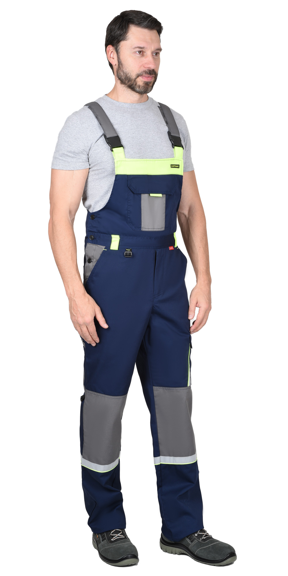Брюки прямые с застёжкой спереди на гульфик с молнией, с отрезным поясом, с накладными карманами спереди, сзади и на боковых швах, с объёмными наколенниками из плотной, непромокаемой ткани с верхним входом для амортизационного вкладыша.