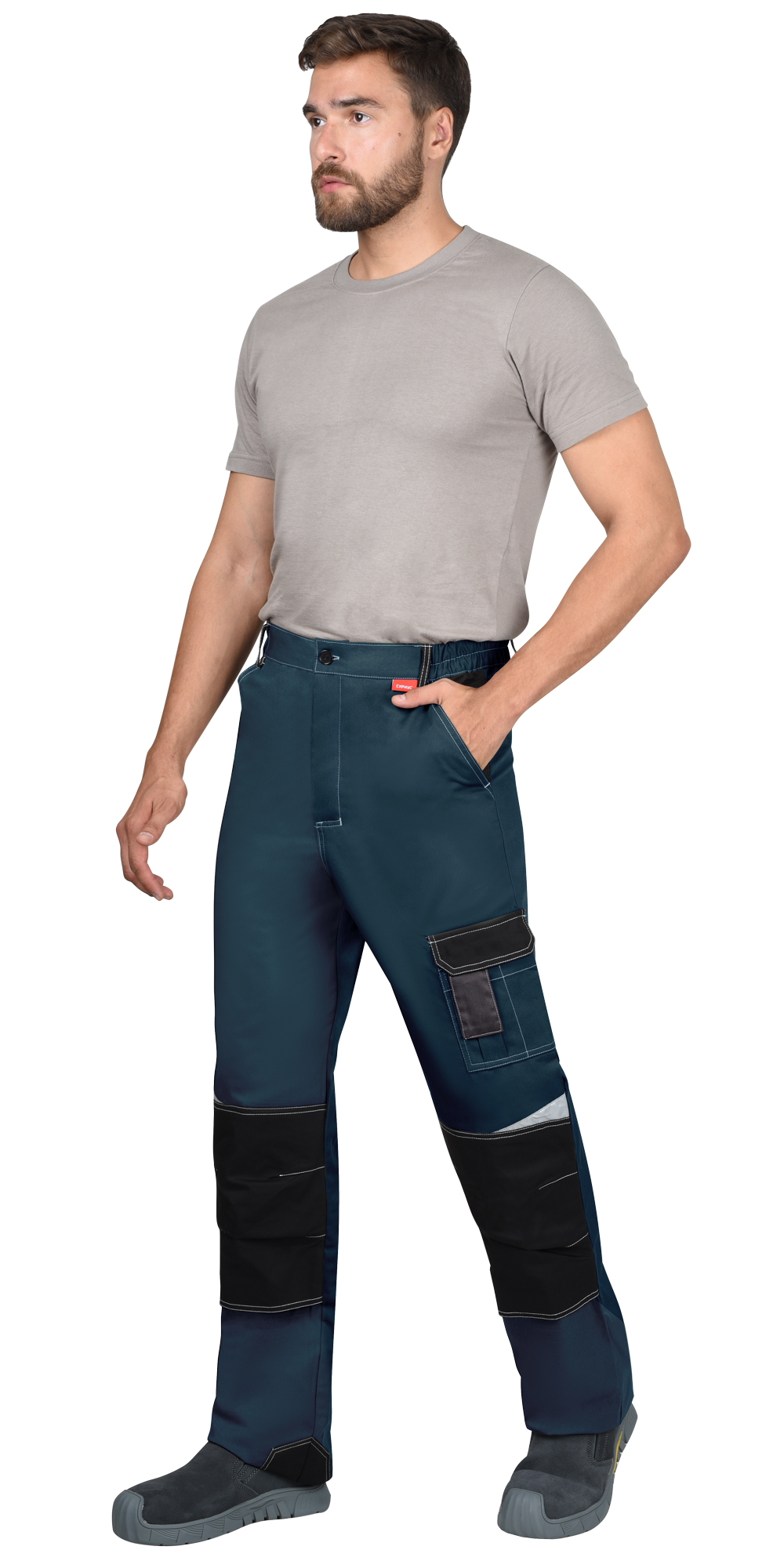 Полукомбинезон прямого силуэта, с застёжкой на молнию: в правом боковом шве и спереди – гульфик. На передних половинках накладки в области колен с возможностью вставки амортизационного вкладыша, внутренние боковые карманы и два накладных кармана. На правой задней половинке накладной карман и двойной карман для инструментов. Спинка полукомбинезона с внутренней резинкой для лучшего прилегания. Полукомбинезон с бретелями, длина регулируется резинкой и застежкой-фастексом.