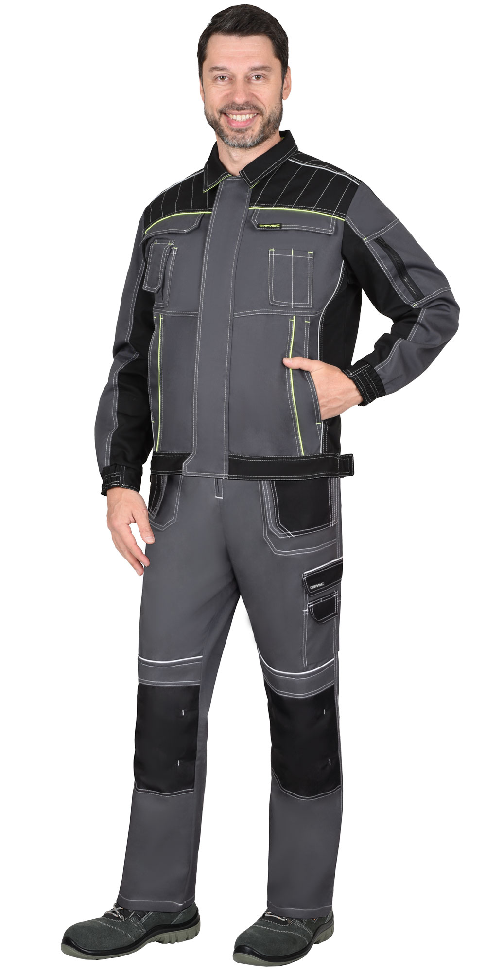 Костюм СИРИУС-ПРЕСТИЖ-Л куртка, п/к, темно-серый с черным и лимонным кантом
