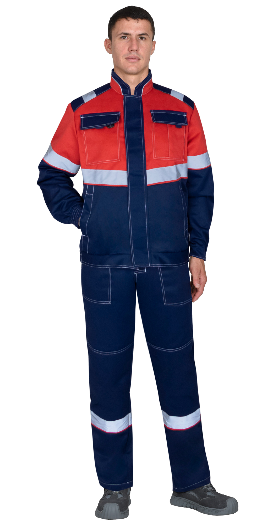 Полукомбинезон с застежкой гульфика на «молнию» и с застежкой в правом боковом шве на три петли и три пуговицы, с нагрудным накладным большим и малым карманом и карманом для телефона, с боковыми внутренними карманами, с накладным карманом на левом боковом шве с клапаном на липучке, с наколенниками, с двумя задними карманами с клапанами , и карманом для инструментов, по спинке вставлена резинка.
