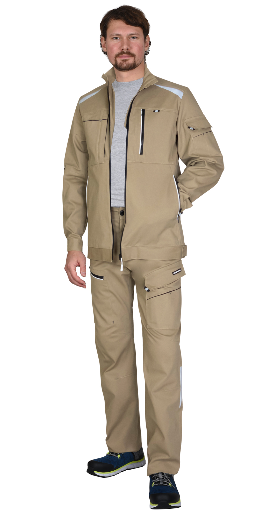 Полукомбинезон прямого силуэта, с застежкой спереди на молнию, с различными многофункциональными карманами, в области колен с усилительными накладками из устойчивой к истиранию, непромокаемой ткани, с возможностью размещения в них амортизационного вкладыша. Полукомбинезон с регулируемыми по длине бретелями. В полукомбинезоне предусмотрен кант СВ 3мм для обозначения сигнальной видимости.