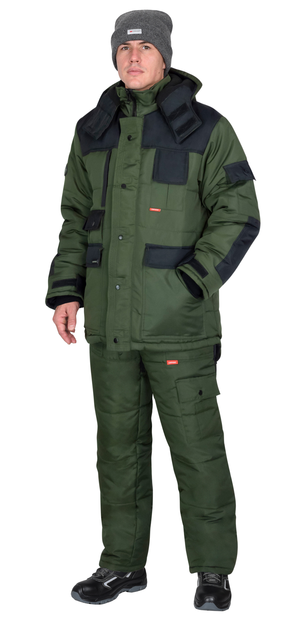 Костюм зимний двухцветный, из полиэфирной ткани с водоотталкивающей пропиткой, состоит из удлинённой куртки и брюк. В костюме предусмотрен светоотражающий кант для обеспечения видимости работающего при любом освещении.