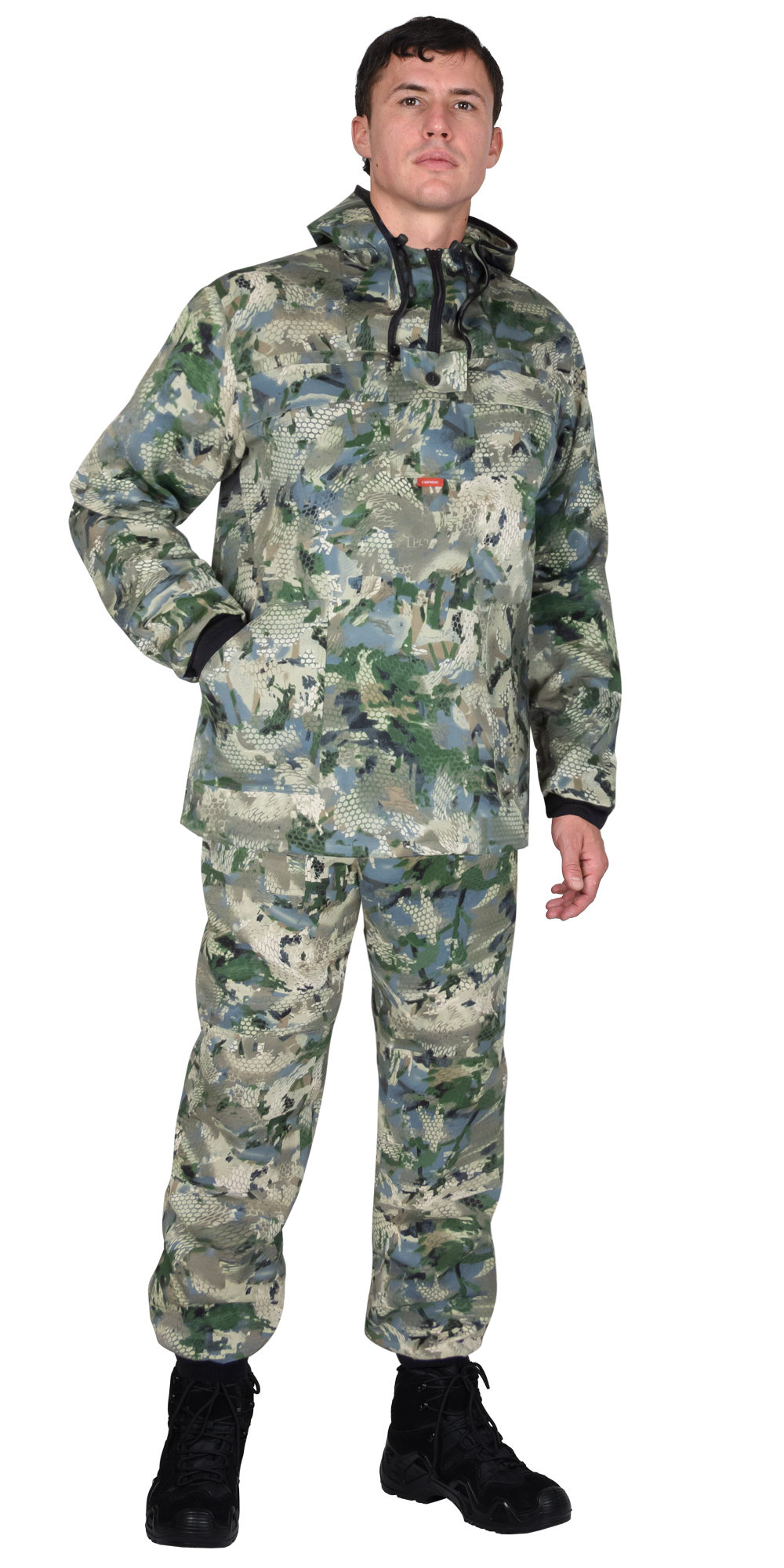 Куртка с притачным капюшоном с противомоскитной сеткой и накладным нагрудным карманом, в который при необходимости можно спрятать противомоскитную сетку. Рукава с трикотажной манжетой, ширина куртки внизу регулируется.