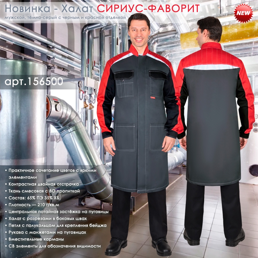 Халат мужской прямого силуэта, с центральной потайной застёжкой на пуговицы, с воротником стойка, с втачными рукавами с манжетой на пуговице, с нагрудными и нижними карманами, с разрезами в боковых швах, спереди и сзади элементы из ленты светоотражающей 50 мм для обеспечения сигнальной видимости. В халате предусмотрено крепление бейджа.