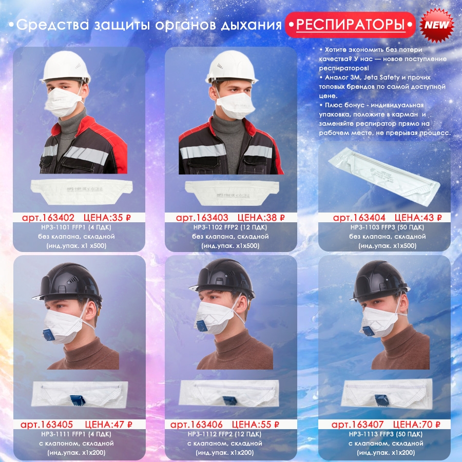 арт.163402 Респиратор НРЗ-1101 FFP1 (4 ПДК) без клапана, складной (инд.упак. х1 х500) Цена: 35 ₽