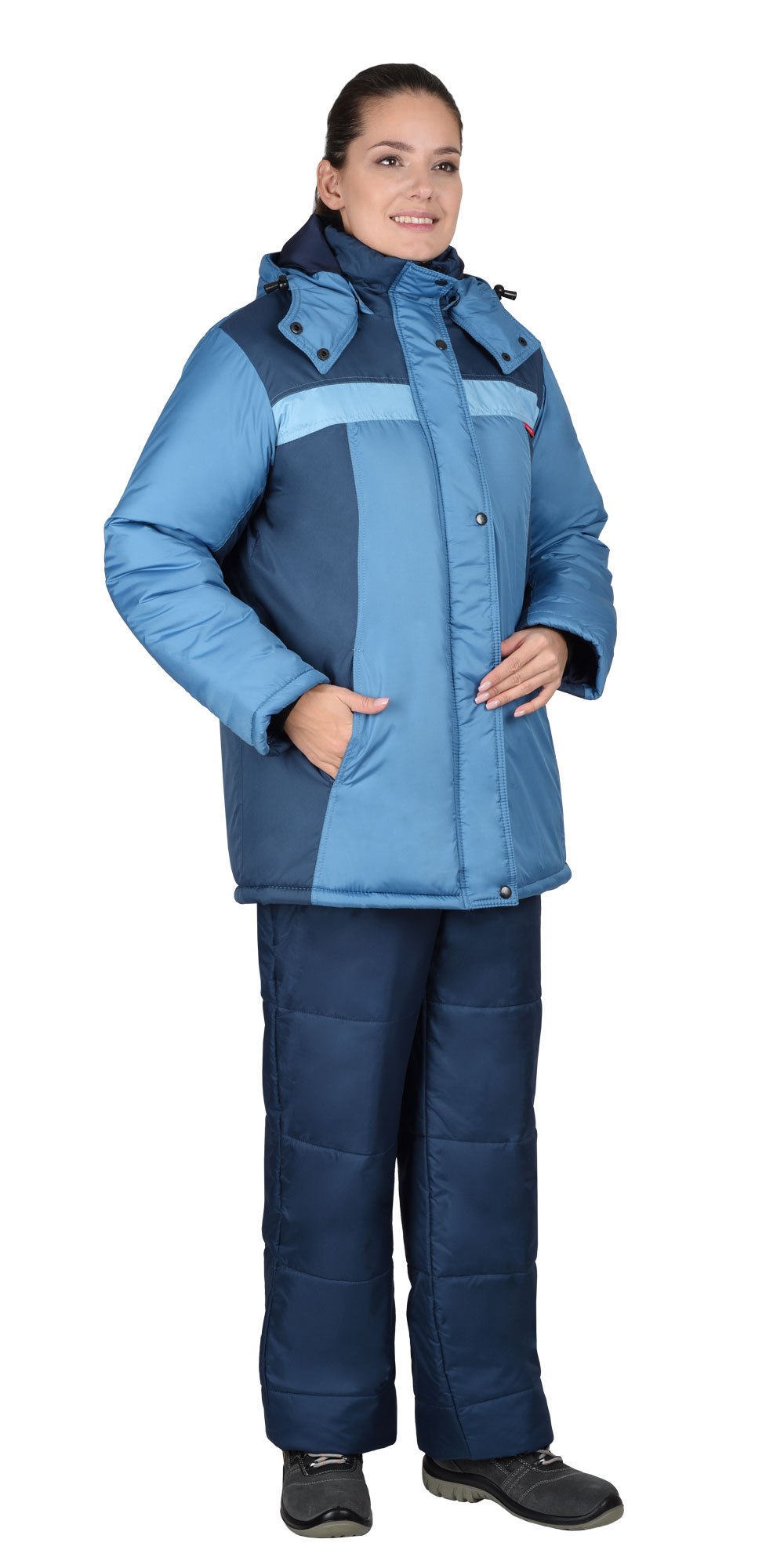 Костюм состоит из куртки и брюк. Куртка укороченная, с центральной застёжкой на молнию, капюшон с утяжкой по лицевому вырезу, верхние накладные карманами с клапанами, застегиваются на потайную липучку, нижние накладные карманы на молнию.