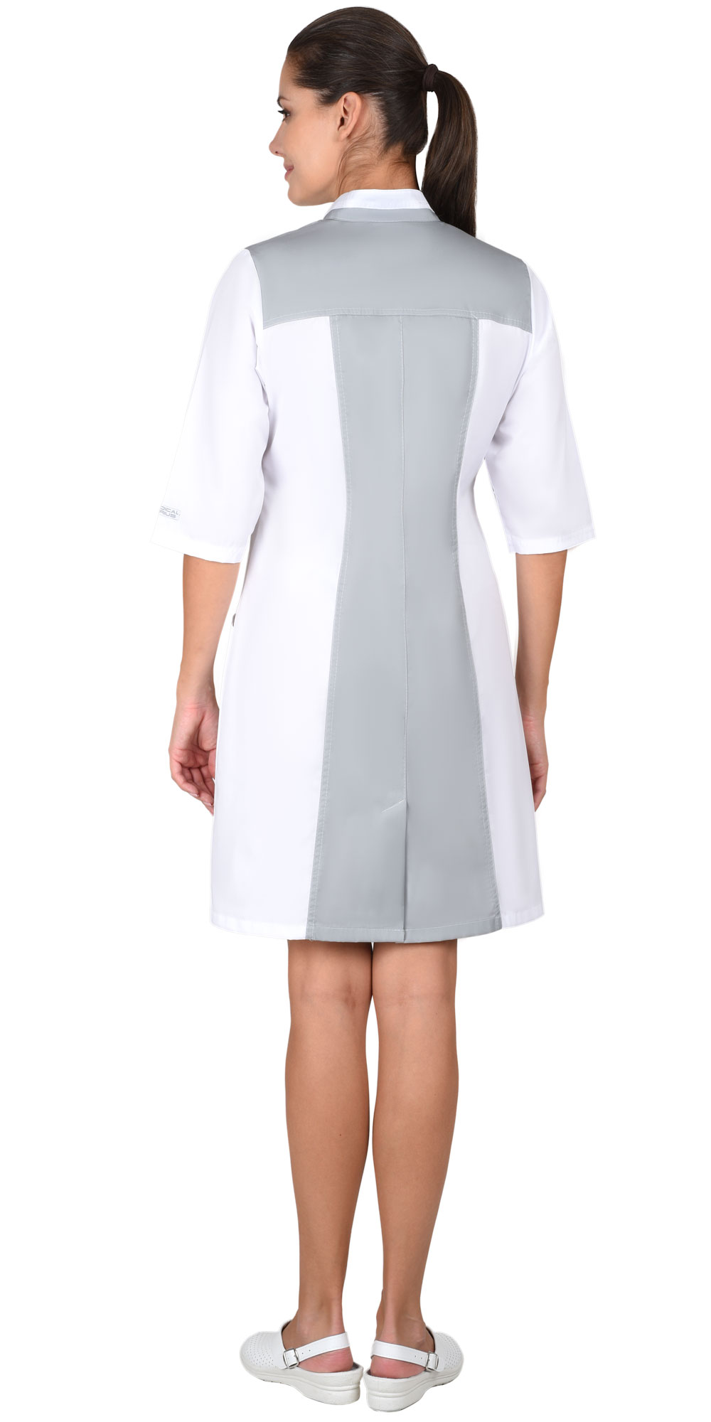 Халат женский, полуприлегающего силуэта с центральной застёжкой на пуговицы, с верхним и нижними фигурными карманами. Воротник «стойка». Рукава втачные, укороченные. Детали халата выполнены из отделочной ткани. По спинке шлица.