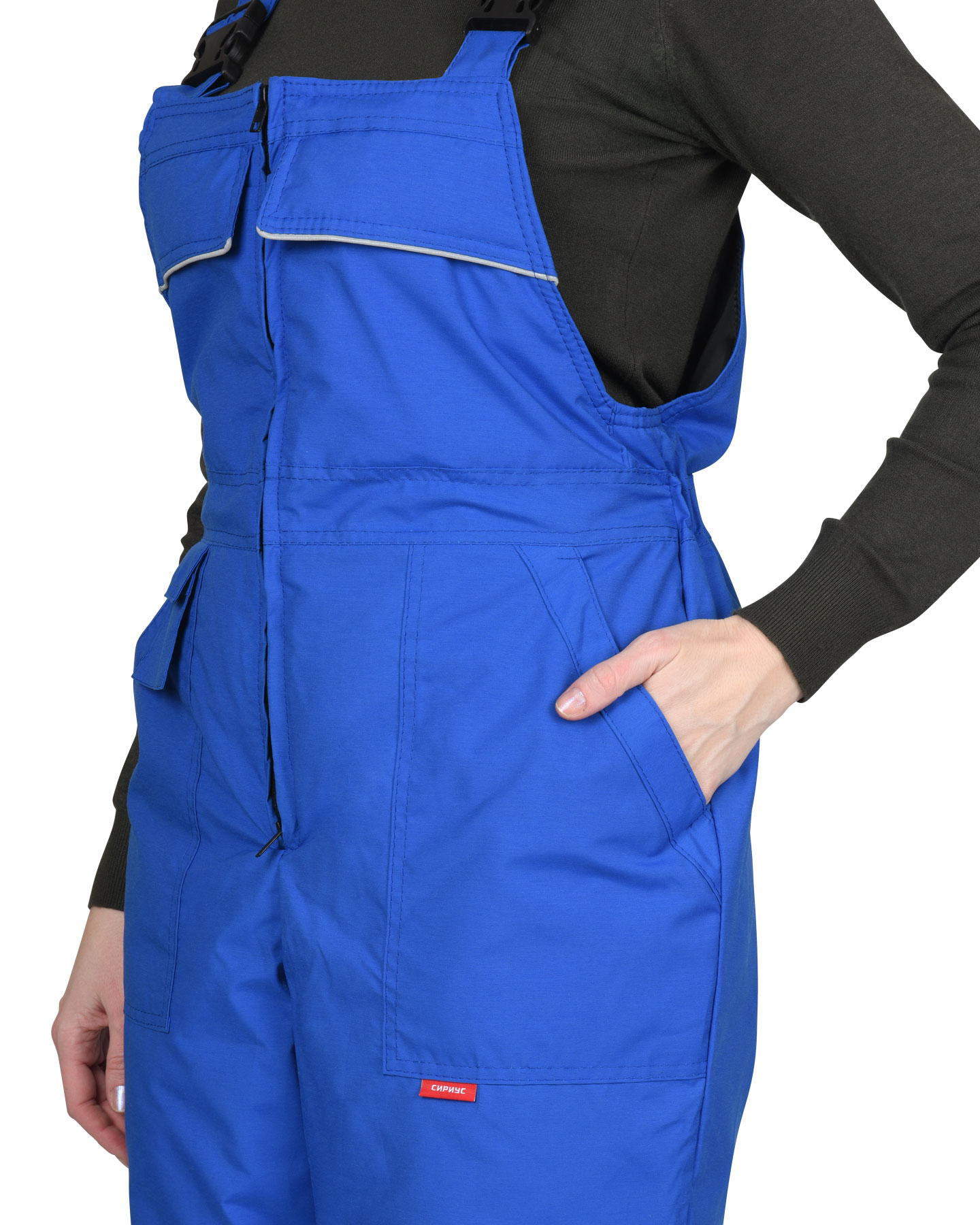 Костюм состоит из куртки и полукомбинезона. Куртка удлиненная прямого силуэта на утепленной подкладке. Центральная застежка - молния, прикрыта ветрозащитной планкой застегивающейся на кнопки. Два верхних кармана и два нижних прорезных кармана. Утепленный пристегивающийся на кнопки капюшон. Пристегивающиеся при помощи молнии рукава. Полукомбинезон на утепленной подкладке с застежкой на молнию. Два нижних кармана с косым входом и один задним накладным карманом. В костюме предусмотрены светоотражающие полосы 25мм для обозначения сигнальной видимости.
