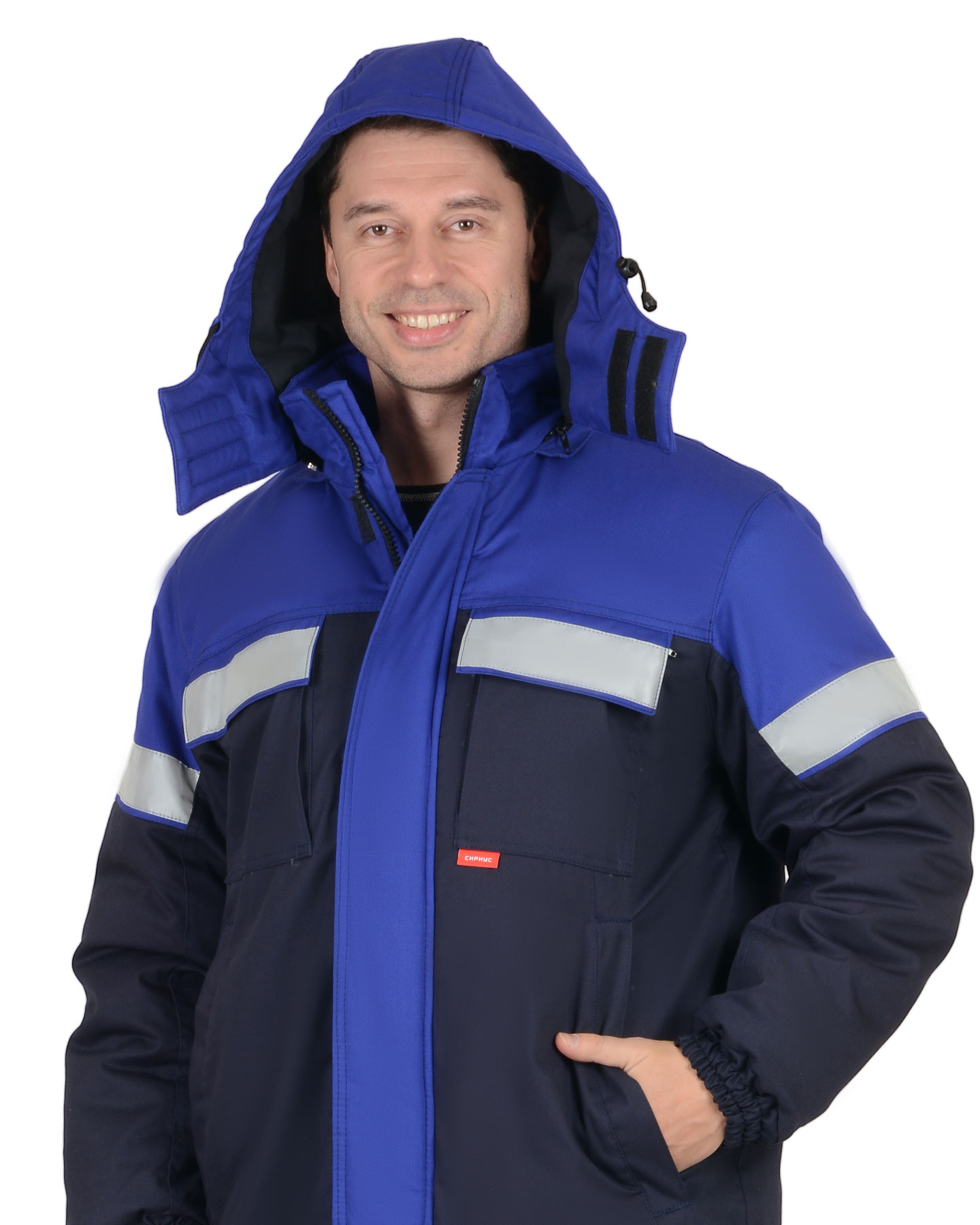 Куртка прямого силуэта с центральной застёжкой на 2-х замковую молнию, ветрозащитной планкой с застежкой на липучку, воротником - стойка и пристёгивающимся капюшоном, верхними накладными карманами с клапанами на липучках, с карманом молния на левой полочке, нижними карманами в рельефах, внутренним на молнии, ветрозащитной юбкой на кнопках. Рукава втачные, с притачной манжетой.