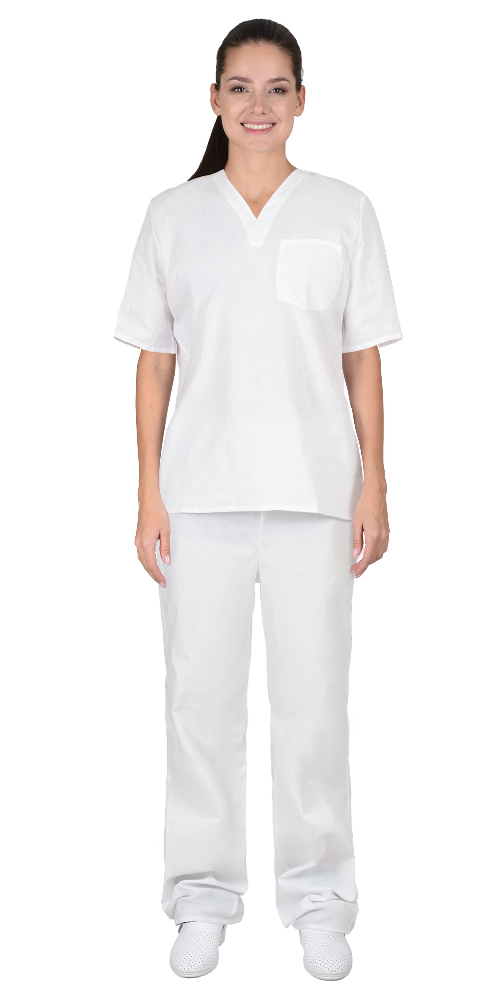 Костюм состоит из блузы и брюк. Блуза с V-образным вырезом горловины, с левым нагрудным карманом. Брюки с резинкой в поясе.