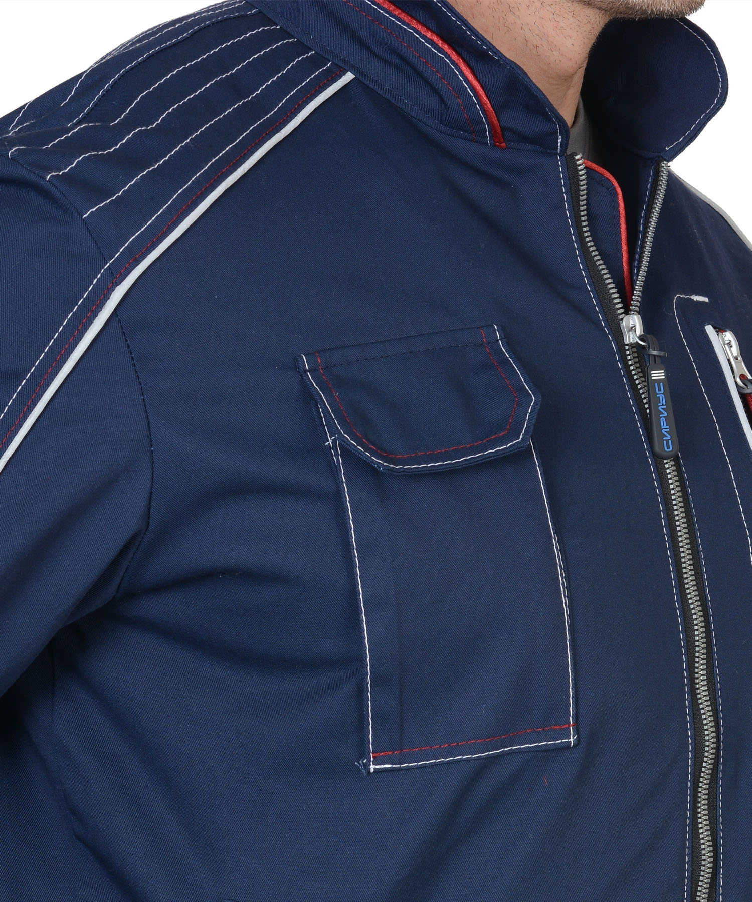 Куртка короткая, воротник стойка; с центральной застежкой на тесьму "молнию"; с внутренней подпланкой; с верхним прорезным карманом на тесьму "молнию" на левой полочке, и с верхним накладным полуобъемным карманом с фигурным клапаном застегивающийся на потайную липучку на правой полочке; с нижними прорезными карманами "листочки", притачной обтачкой низа куртки и манжетами, манжеты частично стянуты резинкой. В куртку предусмотрен СВ кант для обозначения сигнальной видимости