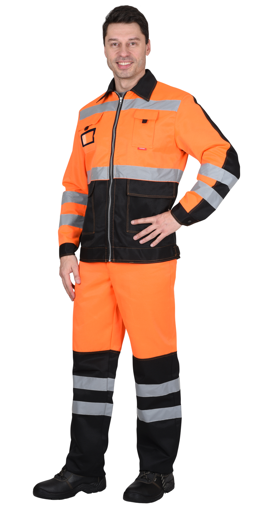 Брюки прямые, на притачном поясе, с застёжкой спереди на молния, с боковыми внутренними карманами, с часовым карманом; на задних половинках с отрезной кокеткой, двумя накладными карманами и карманами под инструменты. В брюках предусмотрен СВ кант для обозначения сигнальной видимости.