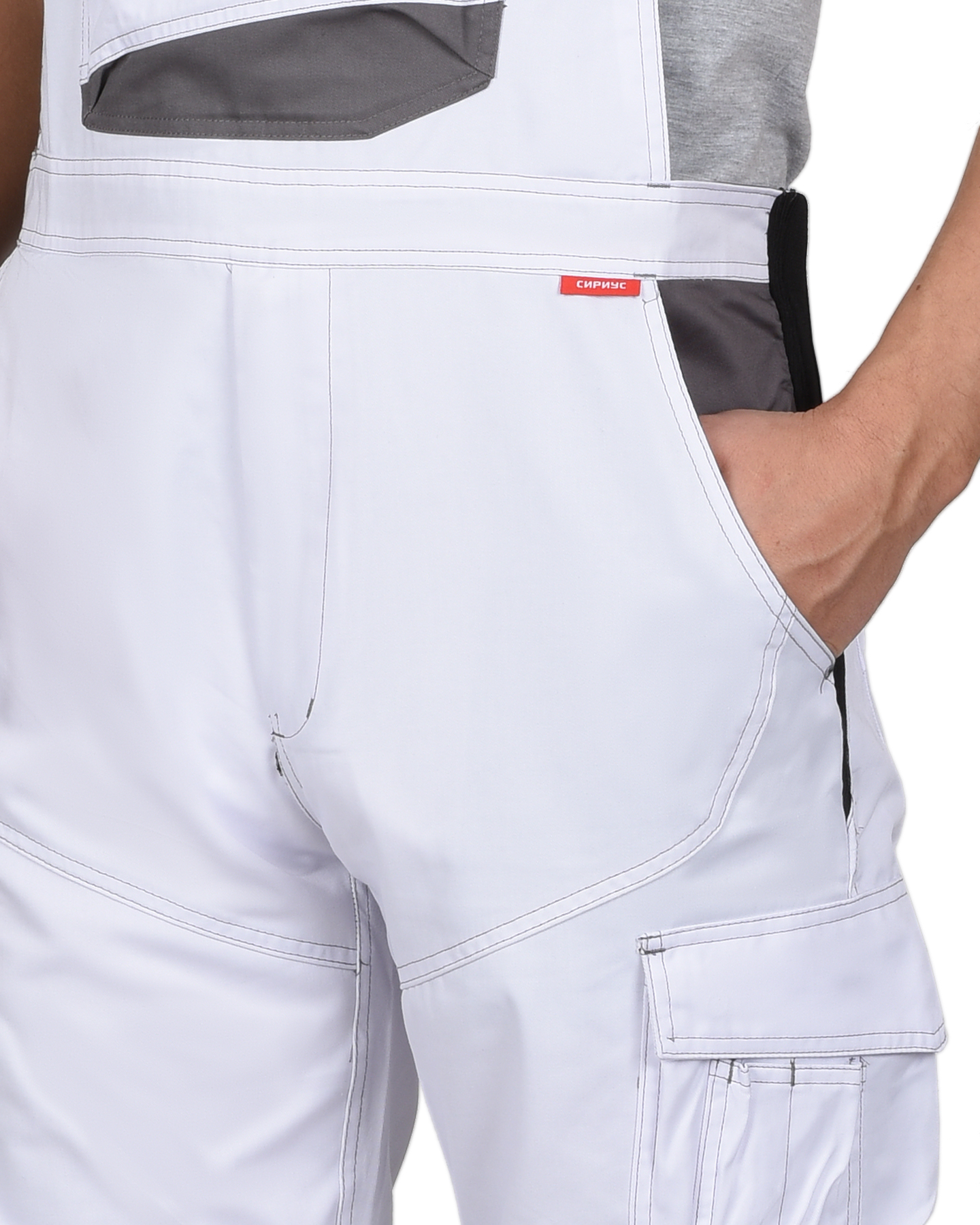 Полукомбинезон прямой с застёжкой спереди - гульфик с молнией, с отрезной грудкой, отрезной спинкой, с бретелями. В боковом шве полукомбинезона со стороны задней половинки вставка из эластичного материала для удобства использования. Полукомбинезон с карманами спереди, сзади и на боковых швах, с объёмными наколенниками из полиэфирной, плотной, непромокаемой ткани с верхним входом для амортизационного вкладыша. Бретели регулируются по длине.