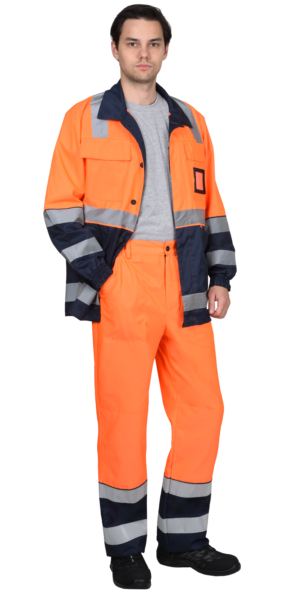 Костюм состоит из куртки и полукомбинезона. Куртка, укороченная с центральной потайной застежкой на молнию, застежкой борта и пояса на липучку. Верхние карманы с клапанами и хлястиком, застегивающимися на липучку. Боковые карманы в вертикальных швах. Пояс регулируется хлястиком на липучке. Воротник отложной. Вертикальные складки спинки увеличивают свободу движения. Контрастная отстрочка швов придает костюму оригинальность. Полукомбинезон, комбинированный с усиленными накладками в области колен, объем по линии талии регулируется тесьмой.Рекомендуется для рабочих специальностей. Современная практичная в эксплуатации и очень экономичная модель летней спецодежды. ГОСТ 12.4.280-2014