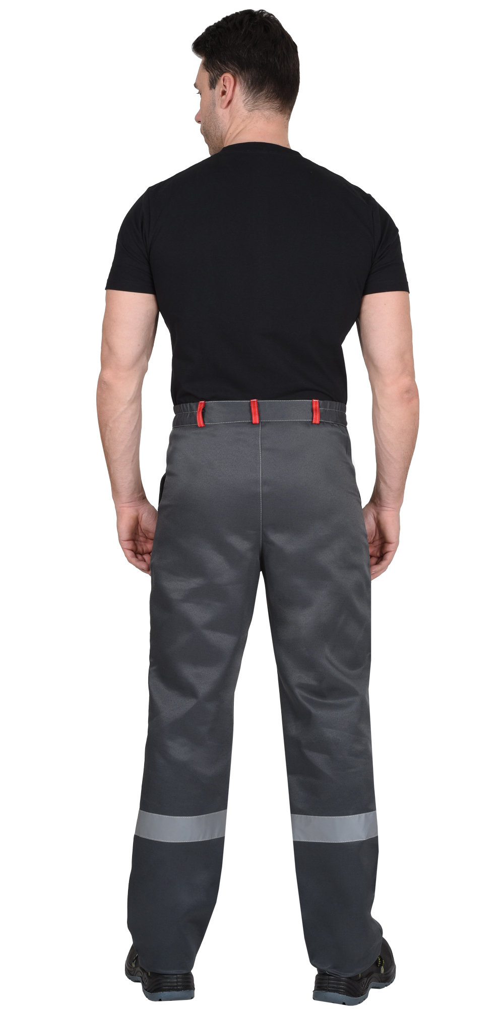 Брюки прямые с застёжкой гульфика на 3 пуговицы, с боковыми накладными карманами и усилительными накладками в области колена. Брюки с отрезным поясом, застёгивается на одну пуговицу, с 5 шлевками, с частичной стяжкой по бокам, для мягкого прилегания.