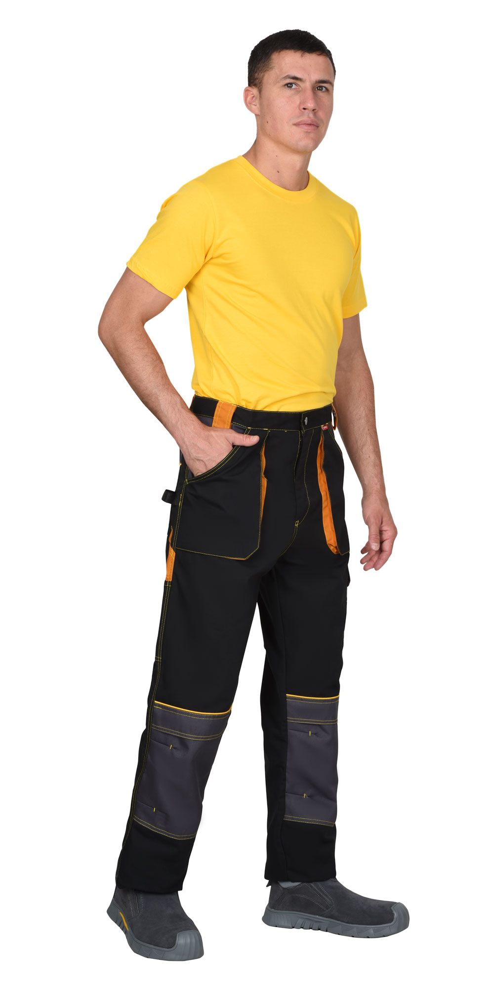 Полукомбинезон прямого силуэта, с застежкой на пуговицы спереди (гульфик) и в правом боковом шве. Сзади полукомбинезон по талии частично стянут резинкой для лучшего прилегания по фигуре. Полукомбинезон спереди с боковыми карманами и нагрудным карманом с клапаном, сзади с двойным карманом для инструментов у правого бокового шва на уровне колена. Полукомбинезон с бретелями с резинкой, длина бретелей регулируется застежкой-фастексом.