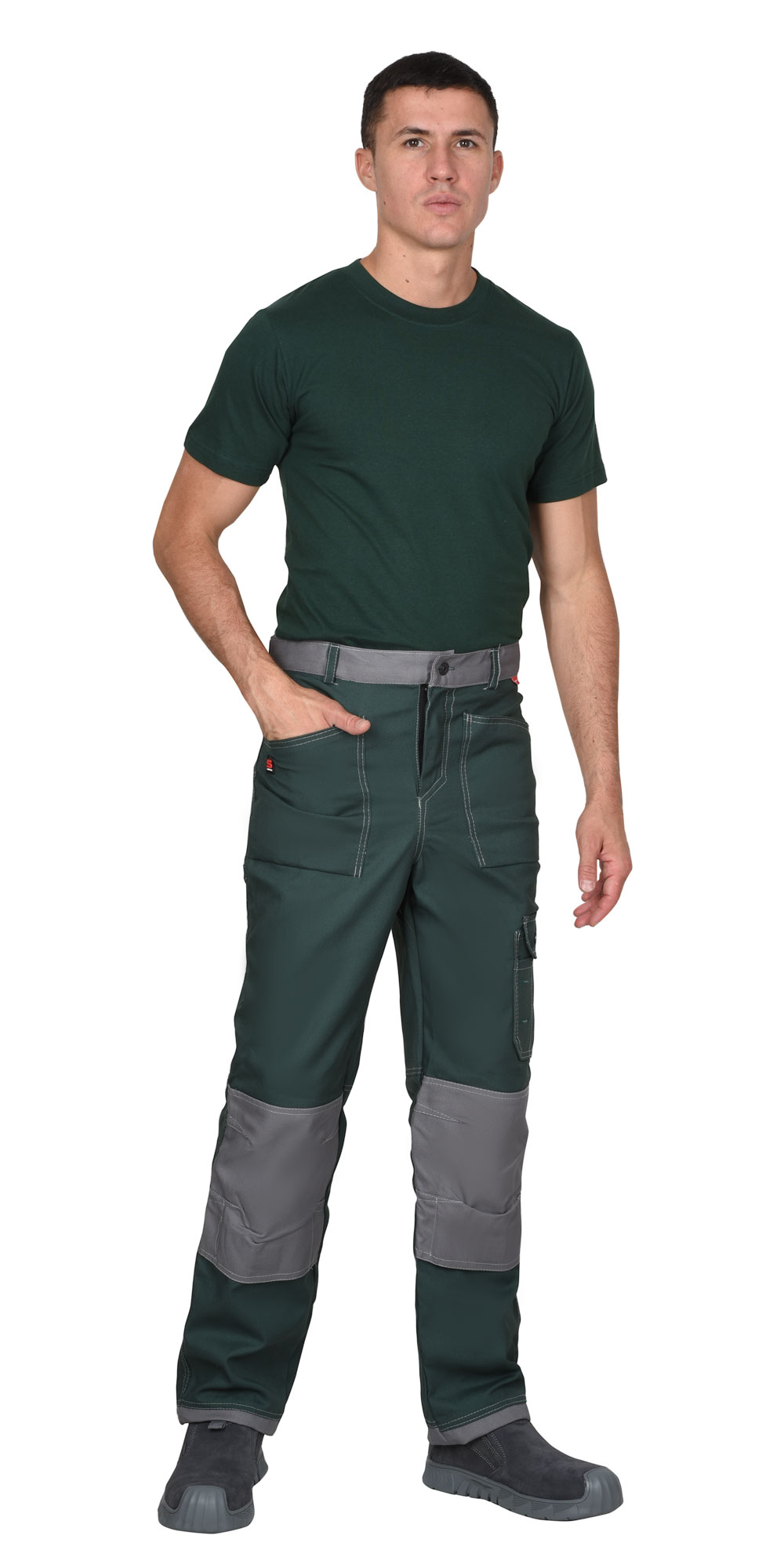 Полукомбинезон с бретелями, которые регулируются спереди с помощью пряжек-фастекс. Бретели из ткани и резинки сзади. Правая бокавая застежка на пуговицах. Центральная застежка на молнию. Грудка с большим накладным карманом с фигурным клапаном на липучку. Под поясом расположены боковые карманы. Слева на боковом шве расположен накладной объемный карман с фигурным клапаном на липучке. Спереди усилительные наколенники. Полукомбинезон сзади с накладными карманами, у бокового шва справа плоские накладные карманы для инструментов, один на другом, внизу которых декоративная тесьма с пряжкой. По талии спереди и сзади шлевки. Сзади резинка, для лучшего прилегания по фигуре.