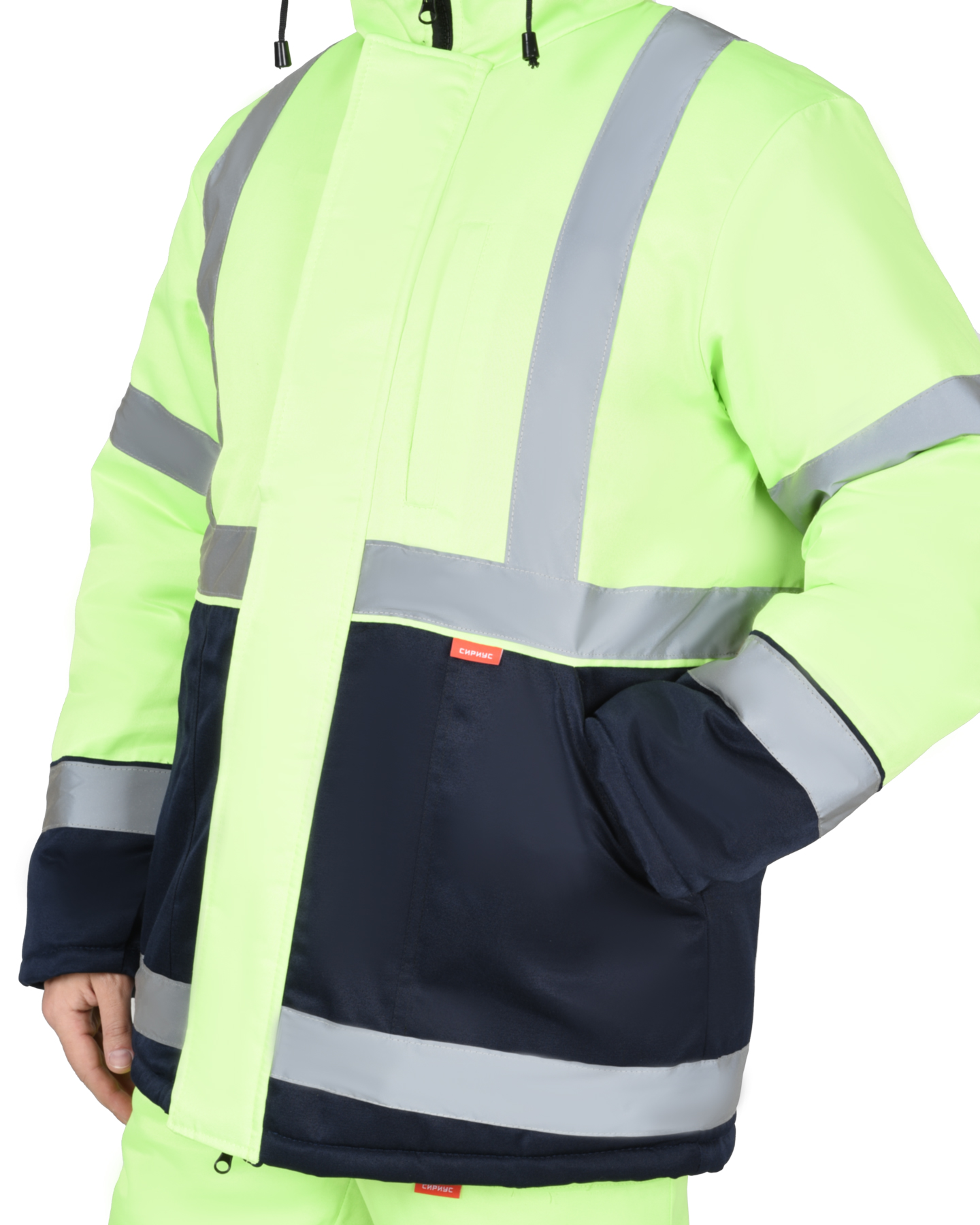 Куртка прямого силуэта; с притачной утеплённой стеганой подкладкой, с центральной застёжкой на двухзамковую тесьму - «молнию» и ветрозащитной планкой застегивающейся на потайные текстильные застежки «липучка» 4 шт., с втачным утепленным капюшоном. Рукава втачные. По полочкам, спинки в области груди, талии, низа и низа рукавов настрачивается СОП 50 мм для обозначения сигнальной видимости. Полукомбинезон прямой, с отрезной грудкой и спинкой, с центральной застёжкой на двухзамковую тесьму - «молния», с накладными боковыми карманами, с эластичной лентой по спинке, для лучшего прилегания. Бретели регулируются при помощи эластичной ленты и пряжек фастексов. Низ изделия выполнен из отделочной ткани. В полукомбинезоне используется СОП 50 мм для обозначения сигнальной видимости.