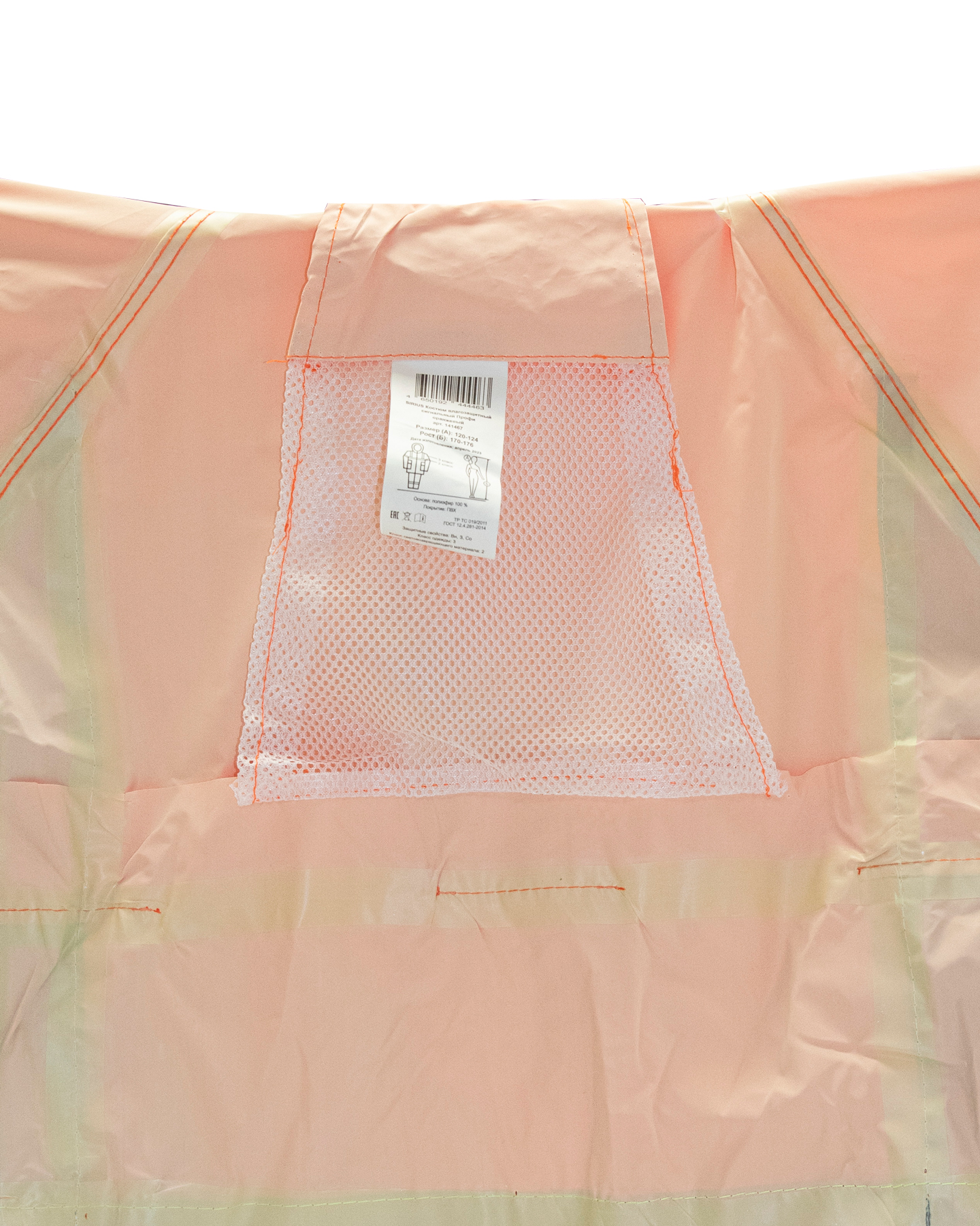 Костюм изготавливается из из прочной плащевой ткани ярко-оранжевого цвета с ПВХ покрытием. Вес ткани — 225 гр./метр.кв.