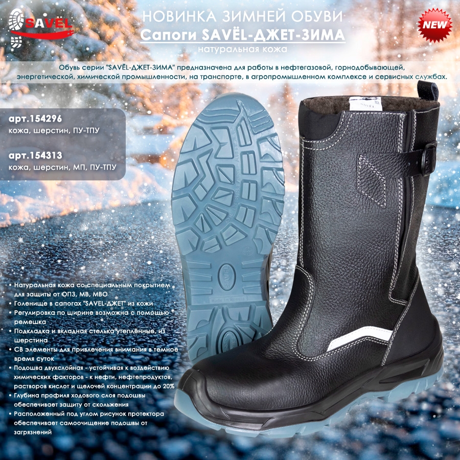Обувь серии "SAVЁL-ДЖЕТ-ЗИМА" предназначена для работы в нефтегазовой, горнодобывающей, энергетической, химической промышленности, на транспорте, в агропромышленном комплексе и сервисных службах.