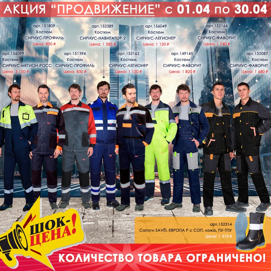 Объявляем о проведении АКЦИИ “ПРОДВИЖЕНИЕ” с 01.04 по 30.04 на летнюю спецодежду и обувь. Количество товара ограничено!