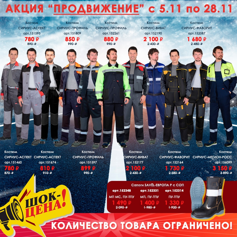 Объявляем о проведении АКЦИИ “ПРОДВИЖЕНИЕ” с 5.11 по 28.11 на летнюю спецодежду. Количество товара ограничено!