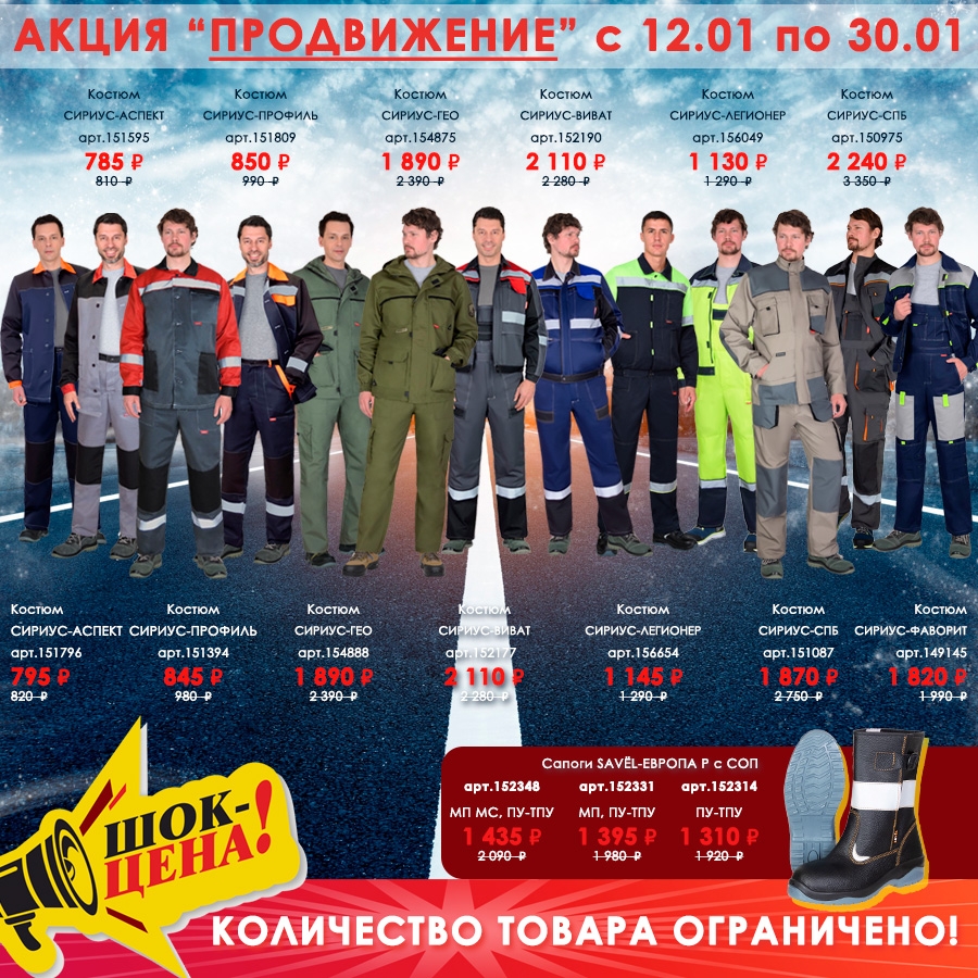 Объявляем о проведении АКЦИИ “ПРОДВИЖЕНИЕ” с 12.01 по 30.01 на летнюю спецодежду и обувь. Количество товара ограничено!